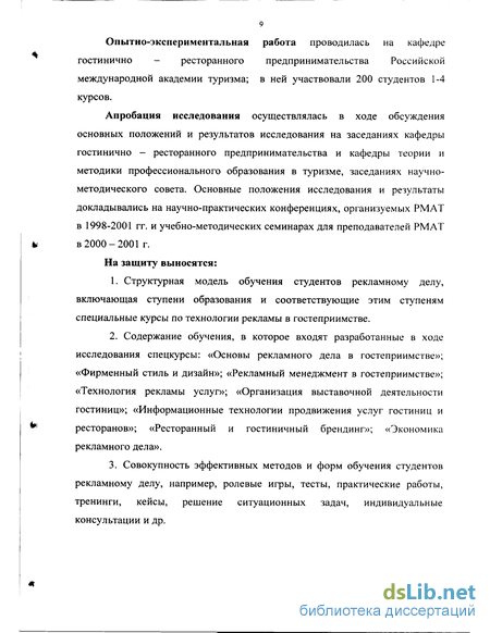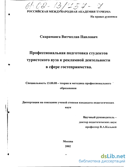 Ряд аспектов исследуемой темы нашли отражение в кандидатских диссертациях В.В. Васильева, Е.Н. Гараниной, Е.Н. Ильиной, Е.В. Мошняги, Т.С. Элиаровой, А.В. Филатова, И.В. Магидовой, Л.Д. Чирковой, Д.А. Ермиловой. Однако, нам не удалось найти исследований, в которых бы рассматривалась проблема профессиональной подготовки студентов туристского вуза к рекламной деятельности в сфере гостеприимства.