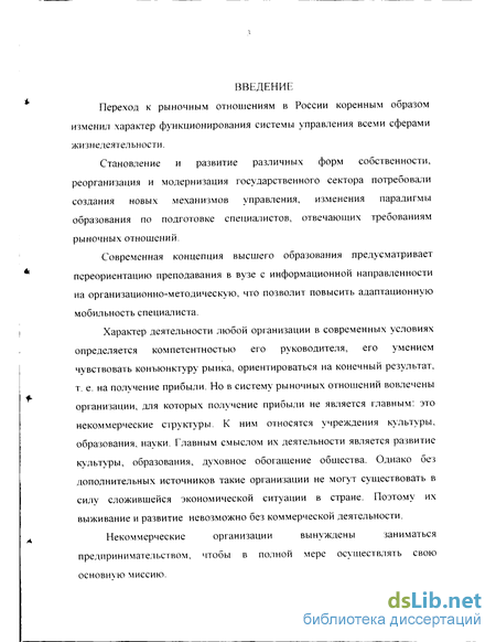 Характер деятельности любой организации в современных условиях определяется компетентностью его руководителя, его умением чувствовать конъюнктуру рынка, ориентироваться на конечный результат, т. е. на получение прибыли. Но в систему рыночных отношений вовлечены организации, для которых получение прибыли не является главным: это некоммерческие структуры. К ним относятся учреждения культуры, образования, науки. Главным смыслом их деятельности является развитие культуры, образования, духовное обогащение общества. Однако без дополнительных источников такие организации не могут существовать в силу сложившейся экономической ситуации в стране. Поэтому их выживание и развитие невозможно без коммерческой деятельности.