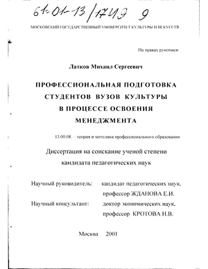Объект исследования: профессиональная подготовка менеджеров в вузах культуры.