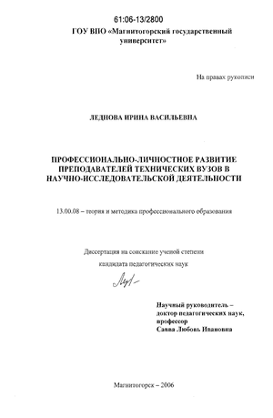 Предмет исследования: процесс профессионально-личностного развития преподавателей технических вузов на основе научно-исследовательской деятельности в системе послевузовского профессионального образования.