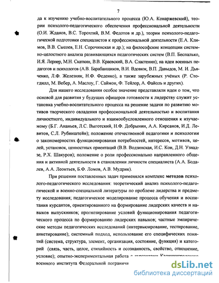 При решении поставленных задач применялся комплекс методов психолого-педагогического исследования: теоретический анализ психолого-педагогической и военно-специальной литературы по проблеме лидерства и предмету исследования; педагогическое моделирование процесса обучения и воспитания курсантов, ориентированного на формирование лидерских качеств и навыков выпускников; прогнозирование условий функционирования педагогического процесса по формированию лидерских навыков; частные эмпирические методы педагогических исследований (интервьюирование, тестирование, анкетирование); системный подход, использование его специфических понятий (система, структура, элемент, организация, состояние, функция) и категорий (связь, часть, целое, стихийность и осознанность, свойство, отношение, условие); опытно-экспериментальная работа с курсантами Калининградского военного института Федеральной пограничной службы и офицерами, прохо-