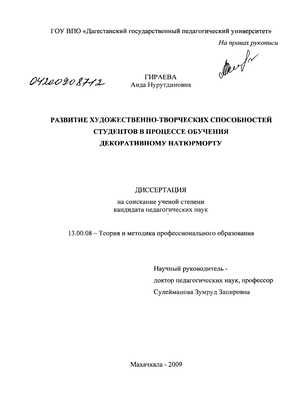 Апробация результатов исследования. Основные результаты исследования докладывались на заседаниях кафедры теории и методики профессионального образования Даггоспедуниверситета и нашли отражение в материалах Всероссийской научно-практической конференции «Художественно-педагогическое образование: состояние, проблемы, перспективы развития» (Махачкала, 2006), в «Искусство и образование» (Москва, 2007), в учебном пособии для студентов «Натюрморт». Основные положения исследования использовались в учебном процессе художественно-графического факультета ГОУ ВПО «Дагестанский государственный педагогический университет».