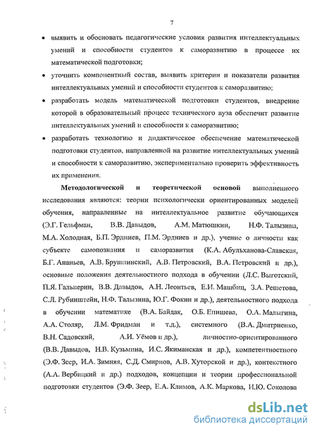 разработать технологию и дидактическое обеспечение математической подготовки студентов, направленной на развитие интеллектуальных умений и способности к саморазвитию, экспериментально проверить эффективность их применения.