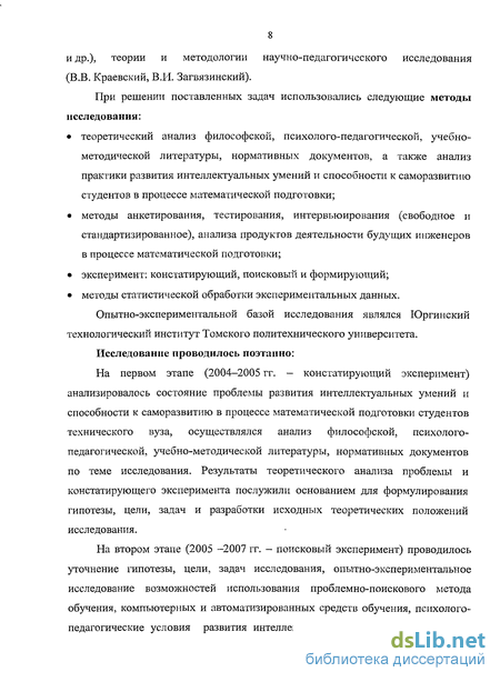 теоретический анализ философской, психолого-педагогической, учебно-методической литературы, нормативных документов, а также анализ практики развития интеллектуальных умений и способности к саморазвитию студентов в процессе математической подготовки;