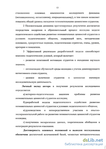 3 Доказана эффективность педагогических условий, направленных на внедрение модели педагогического содействия развитию познавательных ценностей студентов колледжа физической культуры в процессе педагогического общения (развитие познавательной мотивации студентов к овладению научным знанием; оптимизация обучающей среды колледжа с учетом доминирующего когнитивного стиля студента; целевое включение студентов в ценностно значимую исследовательскую деятельность).
