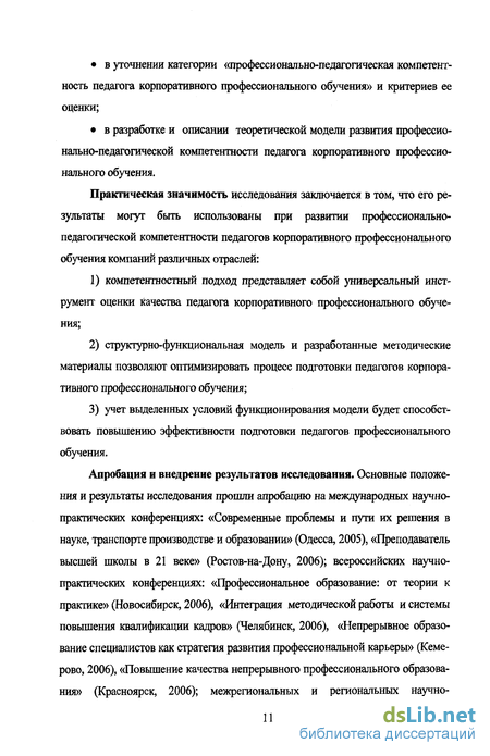 практических конференциях: «Инновационные технологии в педагогике и на производстве» (Екатеринбург, 2004), «Качество образования: методология, теория, практика» (Новосибирск, 2004), «Актуальные проблемы обновления общего и профессионального образования» (Челябинск, 2005), «Высшая школа как социальный институт: история и современность» (Новосибирск, 2006); внедрены в работу предприятий и организаций: Центр подготовки кадров акционерной компании «АЛРОСА» (Мирный), учебно-курсовой комбинат производственного управления «Алмаздортранс» (Ленек), Сибирский горно-химический комбинат (Северск), Горно-химический комбинат (Железногорск). Модель развития профессионально-педагогической компетентности и разработанное учебно-методическое обеспечение применяются в работе Института повышения квалификации и переподготовки работников профессионального образования (Новосибирск), Института перспективных транспортных технологий и повышения квалификации кадров Сибирского государственного университета путей сообщения (Новосибирск), Сибирской кадровой академии (Новосибирск), Новосибирского аэрокосмического колледжа