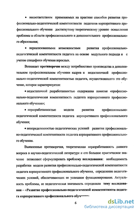 Выявленные противоречия, теоретическая неразработанность данного вопроса в научно-педагогической литературе и его большое практическое значение позволяют сформулировать проблему исследования: необходимость разработки модели развития профессионально-педагогической компетентности педагога корпоративного профессионального обучения, определение педагогических условий, обеспечивающих ее успешное функционирование. Актуальность проблемы, ее педагогическая значимость определили тему исследования - «Развитие профессионально-педагогической компетентности педагога корпоративного профессионального обучения».