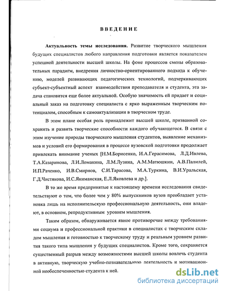 В этом плане особая роль принадлежит высшей школе, призванной сохранить и развить творческие способности каждого обучающегося. В связи с этим изучение природы творческого мышления студентов, выявление механизмов и условий его формирования в процессе вузовской подготовки продолжает привлекать внимание ученых [Н.М.Борисенко, И.А.Герасимова, Л.Д.Ивлева, Т.А.Казаринова, Л.И.Ломакина, Л.М.Лузина, А.М.Матюшкин, А.В.Палилей, И.П.Раченко, И.В.Смирнов, С.И.Тарасова, М.А.Туркина, В.И.Уральская, Г.Д.Чистякова, И.С.Якиманская, Е.Л.Яковлева и др.].