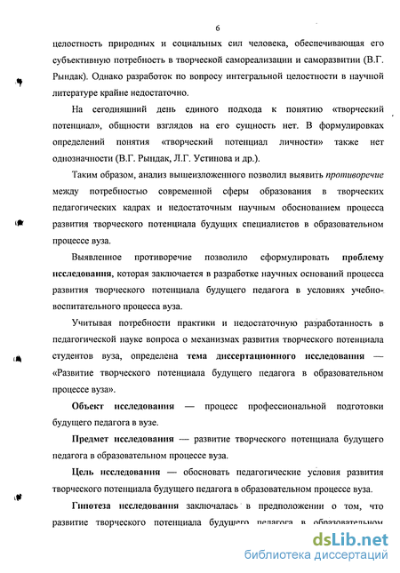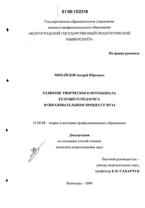 Учитывая потребности практики и недостаточную разработанность в педагогической науке вопроса о механизмах развития творческого потенциала студентов вуза, определена тема диссертационного исследования — «Развитие творческого потенциала будущего педагога в образовательном процессе вуза».