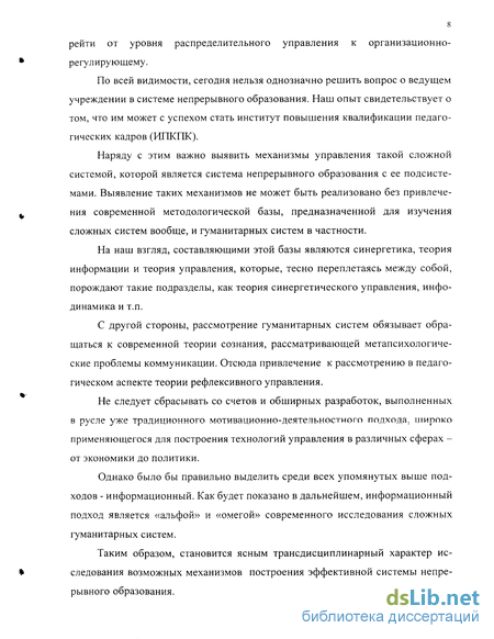 Наряду с этим важно выявить механизмы управления такой сложной системой, которой является система непрерывного образования с ее подсистемами. Выявление таких механизмов не может быть реализовано без привлечения современной методологической базы, предназначенной для изучения сложных систем вообще, и гуманитарных систем в частности.