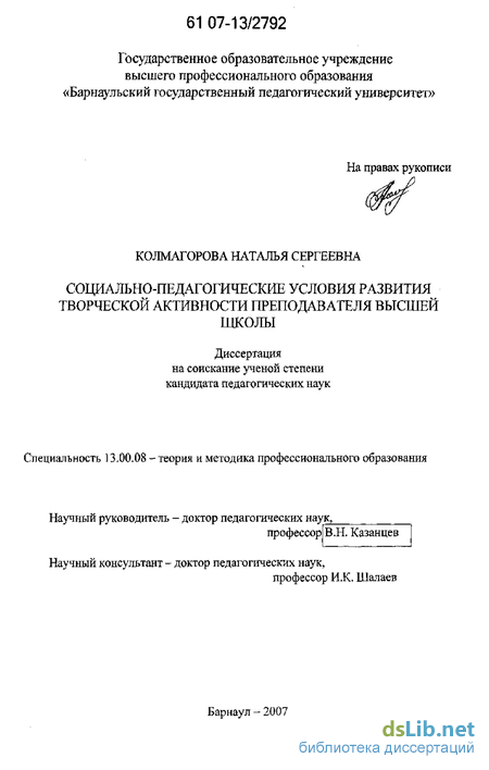 Недостаточная разработанность комплексного подхода к проблеме развития творческой активности преподавателя в психологии и педагогике, а также практическая значимость и актуальность проблемы в условиях деятельности высших учебных заведений обусловили выбор темы данного диссертационного исследования.