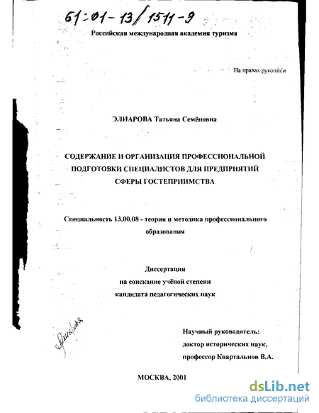Предмет исследования - содержание и организация профессиональной подготовки специалистов для сферы гостеприимства.