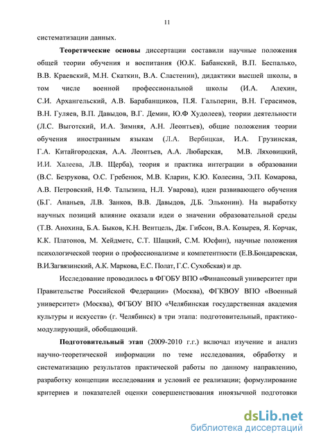 Данное исследовательское направление было сформулировано и разработано на основе анализа проблем, связанных с низким качеством иноязычной подготовки современных специалистов, что негативно отражается на развитии процессов, затрагивающих, нередко, сферу международного взаимодействия в различных областях науки, культуры и экономического производства. В ходе работы была определена методика исследовательской деятельности, ее содержание, структура и способы анализа и трактовки результатов. В качестве базовой гипотезы эксперимента рассматривалась основная гипотеза исследования, а также тенденции и особенности современной науки и практики использования иностранного языка в профессиональной деятельности. В результате всестороннего анализа была сформулирована частная гипотеза о путях совершенствования иноязычной подготовки студентов, основными из которых являются: формирование профессиональной иноязычной коммуникативной компетентности студентов, совершенствование образовательной среды иноязычной подготовки студентов на основе профессионально-творческой интеграции, развитие навыков самостоятельности познавательной деятельности студентов в ходе иноязычной подготовки. Педагогический эксперимент проходил в условиях реального учебного процесса в ФГОБУ ВПО «Финансовый университет при Правительстве Российской Федерации» (Москва), ФГКВОУ ВПО «Военный университет» Минобороны РФ (Москва), ФГБОУ ВПО «Челябинская государственная академия культуры и искусств» (г.Челябинск). Программы обучения в данных образовательных учреждениях включают изучение иностранного языка в перечень обязательных предметов образовательного процесса профессиональной подготовки специалиста по таким направлениям, как 080100.62 - «Экономика», 080500.62 - «Менеджмент», 040100.62 - «Социология», 010400.62 - «Прикладная математика и информатика», 230700.62 - «Прикладная информатика». Дисциплина «Иностранный язык» базируется на знаниях, предусмотренных