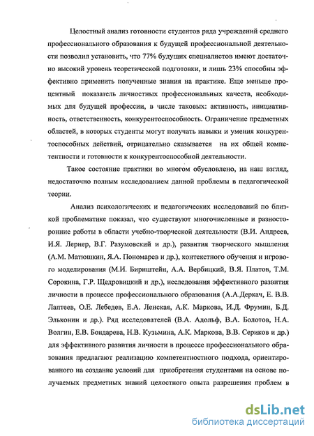 Анализ психологических и педагогических исследований по близкой проблематике показал, что существуют многочисленные и разносторонние работы в области учебно-творческой деятельности (В .И. Андреев, И.Я. Лернер, В.Г. Разумовский и др.), развития творческого мышления (A.M. Матюшкин, Я.А. Пономарев и др.), контекстного обучения и игрового моделирования (М.И. Бирнштейн, А.А. Вербицкий, В.Я. Платов, Т.М. Сорокина, Г.Р. Щедровицкий и др.), исследования эффективного развития личности в процессе профессионального образования (А.А.Деркач, Е. В.В. Лаптеев, О.Е. Лебедев, Е.А. Ленская, А.К. Маркова, И.Д. Фрумин, Б.Д. Эльконин и др.). Ряд исследователей (В.А. Адольф, В.А. Болотов, Н.А. Волгин, Е.В. Бондарева, Н.В. Кузьмина, А.К. Маркова, В.В. Сериков и др.) для эффективного развития личности в процессе профессионального образования предлагают реализацию компетентностного подхода, ориентированного на создание условий для приобретения студентами на основе получаемых предметных знаний целостного опыта разрешения проблем в