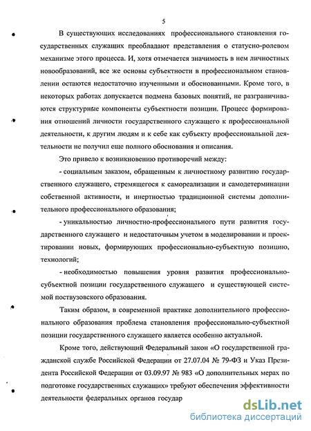 Вместе с тем, анализ философской, социологической, педагогической и психологической литературы показал, что, с одной стороны, проблема развития личности, в том числе и государственного служащего, широко рассматривается в научных работах, а с другой стороны, нет научно-обоснованной, целостной концепции развития профессионально-субъектной позиции государственного служащего в процессе дополнительного профессионального образования. ,