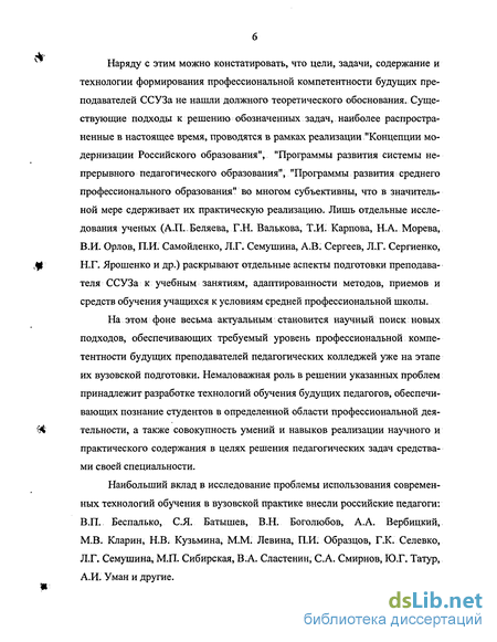 Наряду с этим можно констатировать, что цели, задачи, содержание и технологии формирования профессиональной компетентности будущих преподавателей ССУЗа не нашли должного теоретического обоснования. Существующие подходы к решению обозначенных задач, наиболее распространенные в настоящее время, проводятся в рамках реализации "Концепции модернизации Российского образования", "Программы развития системы непрерывного педагогического образования", "Программы развития среднего профессионального образования" во многом субъективны, что в значительной мере сдерживает их практическую реализацию. Лишь отдельные исследования ученых (А.П.. Беляева, Т.Н. Валькова, Т.И: Карпова, Н.А. Морева, В.И. Орлов, П.И. Самойленко, Л.Г. Семушина, А.В, Сергеев, Л.Г. Сергиенко, Н.Г. Ярошенко и др.) раскрывают отдельные аспекты подготовки преподавателя ССУЗа к учебным занятиям, адаптированности методов, приемов и средств обучения учащихся к условиям средней профессиональной школы.