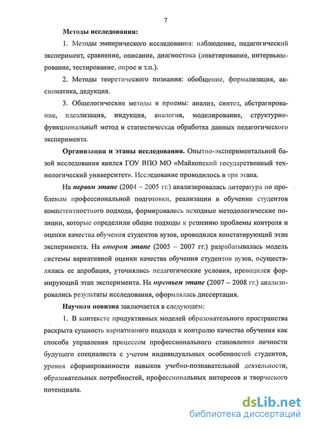 На первом этапе (2004 - 2005 гг.) анализировалась литература по проблемам профессиональной подготовки, реализации в обучении студентов компетентностного подхода, формировались исходные методологические позиции, которые определили общие подходы к решению проблемы контроля и оценки качества обучения студентов вузов, проводился констатирующий этап эксперимента. На втором этапе (2005 - 2007 гг.) разрабатывалась модель системы вариативной оценки качества обучения студентов вузов, осуществлялась ее апробация, уточнялись педагогические условия, проводился формирующий этап эксперимента. На третьем этапе (2007 - 2008 гг.) анализировались результаты исследования, оформлялась диссертация.