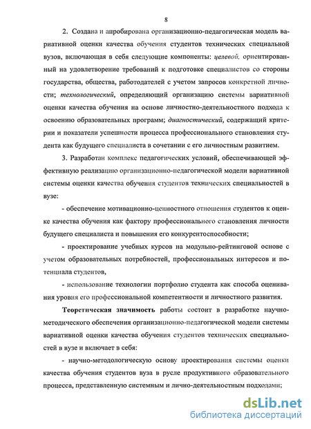 2. Создание вариативной оценки качества обучения студентов технических специальностей вуза осуществляется посредством разработки и внедрения организационно-педагогической модели, представленной совокупностью компонентов: целевого, ориентированного на удовлетворение требований к подготовке специалистов со стороны государства, общества и работодателей с учетом запросов конкретной личности; технологического, определяющего организацию системы вариативной оценки качества обучения на основе лич-ностно-деятельностного подхода к освоению образовательных программ; диагностического, содержащего критерии и показатели успешности процесса профессионального становления студента как будущего специалиста в сочетании с его личностным развитием.