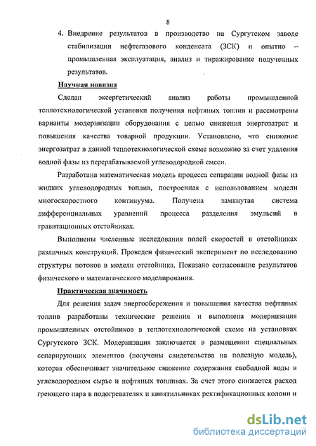 Для решения задач энергосбережения и повышения качества нефтяных топлив разработаны технические решения и выполнена модернизация промышленных отстойников в теплотехнологическои схеме на установках Сургутского ЗСК. Модернизация заключается в размещении специальных сепарирующих элементов (получены свидетельства на полезную модель), которая обеспечивает значительное снижение содержания свободной воды в углеводородном сырье и нефтяных топливах. За счет этого снижается расход греющего пара в подогревателях и кипятильниках ректификационных колонн и
