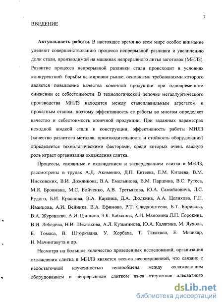 Достоверность и обоснованность результатов работы. Работа выполнена на основе экспериментальных и теоретических исследований с применением стандартного программного обеспечения и собственных программных разработок. Экспериментальные измерения осуществлены в натурных условиях сортовой и слябовой МНЛЗ с помощью стандартных приборов с известным классом точности. Использовались также данные, регистрируемые в системе автоматизации машин непрерывного литья заготовок. Достоверность результатов численного моделирования процессов затвердевания и теплообмена определялась тестированием расчетных программ, сравнением расчетных данных с собственными экспериментальными данными и известными в литературе результатами исследований, а также согласованием их с положениями фундаментальных наук и результатами промышленной эксплуатации.