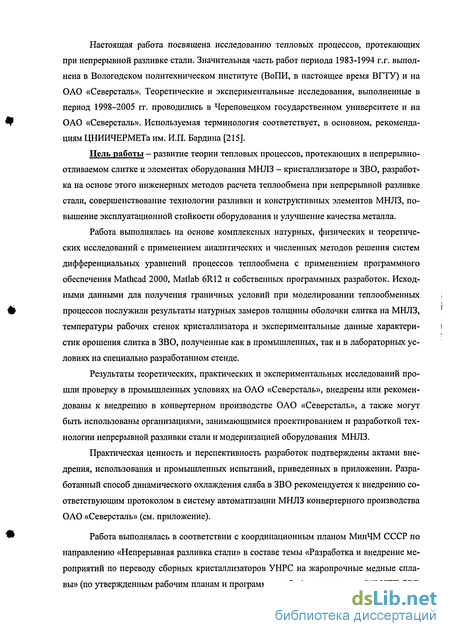 Несмотря на большое количество проведенных исследований и разработанных на их основе методов расчета, тепловые процессы в криволинейных слябовых МНЛЗ изучены недостаточно, что сдерживает эффективность их использования. Настоящая работа посвящена исследованию тепловых процессов, протекающих при непрерывной разливке стали. Значительная часть работ периода 1983-1994 г.г. выполнена в Вологодском политехническом институте (ВоПИ, в настоящее время ВГТУ) и на ОАО «Северсталь». Теоретические и экспериментальные исследования, выполненные в период 1998-2005 гг. проводились в Череповецком государственном университете и на ОАО «Северсталь». Используемая терминология соответствует, в основном, рекомендациям ЦНИИЧЕРМЕТа им. И.П. Бардина [215].