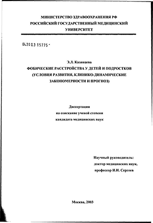 Казанцева Элла Львовна. Фобические расстройства у детей и подростков (условия развития, клинико-динамические закономерности и прогноз) : диссертация ... кандидата медицинских наук : 14.00.18 / Казанцева Элла Львовна; [Место защиты: Московский научно-исследовательский институт психиатрии].- Москва, 2003.- 225 с.: ил.
