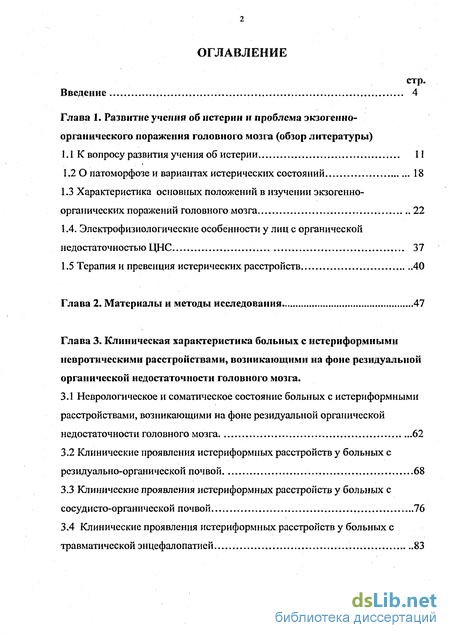В настоящее время многие исследователи (Дюкова Г.М., 1999; Вейн A.M., 2006) подтверждают, что в формировании истерических состояний важную роль играет церебрально-органическая патология; последствия черепно-мозговой травмы, нейроинфекции. Для зарубежных исследований характерна синдромальная оценка этих состояний без акцента на нозологической определенности (Folstein M.F. et.al.,1975; Horton P.S., 1976; Lipowski L.J., 1980; Mc.Kenzie T.B. et.al., 1983; Lipsanen T.et al., 2004).