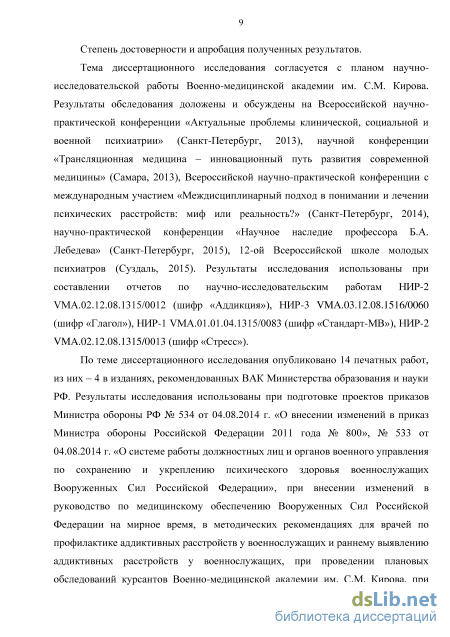 По теме диссертационного исследования опубликовано 14 печатных работ, из них - 4 в изданиях, рекомендованных ВАК Министерства образования и науки РФ. Результаты исследования использованы при подготовке проектов приказов Министра обороны РФ № 534 от 04.08.2014 г. «О внесении изменений в приказ Министра обороны Российской Федерации 2011 года № 800», № 533 от 04.08.2014 г. «О системе работы должностных лиц и органов военного управления по сохранению и укреплению психического здоровья военнослужащих Вооруженных Сил Российской Федерации», при внесении изменений в руководство по медицинскому обеспечению Вооруженных Сил Российской Федерации на мирное время, в методических рекомендациях для врачей по профилактике аддиктивных расстройств у военнослужащих и раннему выявлению аддиктивных расстройств у военнослужащих, при проведении плановых обследований курсантов Военно-медицинской академии