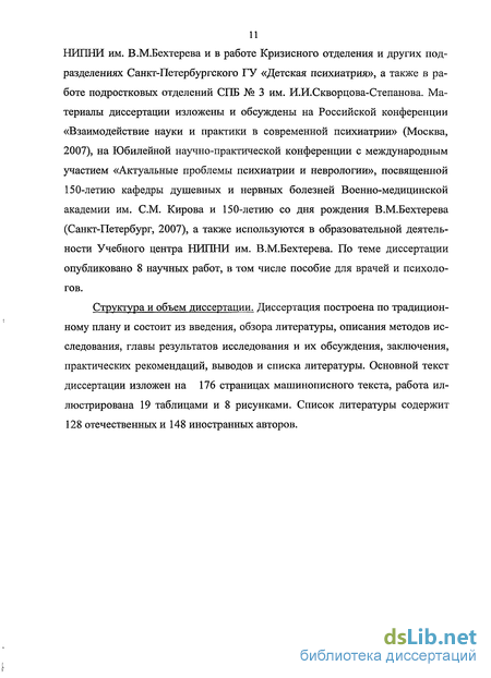 НИПНИ им. В.М.Бехтерева и в работе Кризисного отделения и других подразделениях Санкт-Петербургского ГУ «Детская психиатрия», а также в работе подростковых отделений СПБ № 3 им. И.И.Скворцова-Степанова. Материалы диссертации изложены и обсуждены на Российской конференции «Взаимодействие науки и практики в современной психиатрии» (Москва, 2007), на Юбилейной научно-практической конференции с международным участием «Актуальные проблемы психиатрии и неврологии», посвященной 150-летию кафедры душевных и нервных болезней Военно-медицинской академии им. СМ. Кирова и 150-летию со дня рождения В.М.Бехтерева (Санкт-Петербург, 2007), а также используются в образовательной деятельности Учебного центра НИПНИ им. В.М.Бехтерева. По теме диссертации опубликовано 8 научных работ, в том числе пособие для врачей и психологов.