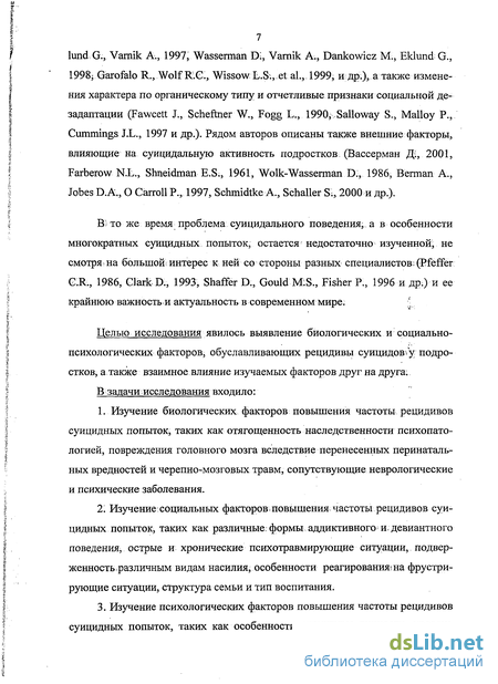 Изучение социальных факторов повышения частоты рецидивов суицидных попыток, таких как различные, формы аддиктивного и; девиантного поведения, острые и хронические психотравмирующие ситуации, подверженность различным видам насилия, особенности реагирования! на фрустри-рующие ситуации, структура семьи и тип воспитания.