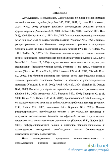Актуальность исследования. Сдвиг акцента психиатрической помощи на внебольничные службы (Ястребов B.C., 1999, 2001; Гурович И.Я. и соавт., 2004; WHO, 2001) обострил проблему несоблюдения больными режима фармакотерапии (Аведисова А.С., 2000; Любов Е.Б., 2001; Незнанов Н.Г., Вид В.Д., 2004; Healey A; et al., 1998). Так, 70% больных шизофренией уклоняются в той или иной мере от лекарственного лечения (Neumann N.U., 1999), причем, распространенность несоблюдения лекарственного режима в популяции больных растет по мере увеличения сроков лечения (Weiden P., Olfson М., 1995; Perkins D., 2002). Несоблюдение режима - одна из главных причин низкой клинической эффективности психофармакотерапии (Любов Е.Б., 2001; Nasrallah Н., Lasser N., 2006) и существенных экономических издержек для медицинских (психиатрических) служб, больного и его семьи, общества в целом (Glazer W., Ereshefsky L., 1996; Lacombe P.S. et al., 1996; Misdrahi D. et al., 2002). Все большее внимание как фактор риска несоблюдения режима лечения привлекает отношение больного к лечению и удовлетворенность помощью (Voruganti L. et al., 2000; Awad A.G. et al., 2004; Nasrallah H., Dursun S.M., 2006). Выделен ряд вариантов нарушения режима психофармакотерапии (Любов Е.Б., 2001; Аведисова А.С., Бородин В.И., 2005; Thompson С. et al, 2000; Gilmer Т.Р., Dolder C.R. et al., 2004), представляющий собой континуум от полного отказа от лечения до избыточного потребления лекарств (Гурович И.Я., Любов Е.Б., 2003; Аведисова А.С., Бородин В.И., 2005). Однако распространенность несоблюдения режима и его отдельных вариантов в популяции отечественных больных шизофренией, самых дорогостоящих пациентов психоневрологических диспансеров (Гурович И.Я., Любов Е.Б., 2003), дифференцированный подход к снижению клинико-социальных и экономических последствий несоблюдения режима фармакотерапии шизофрении изучены недостаточно.