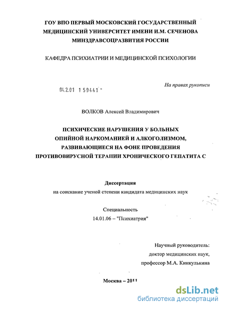 Целью работы является клинико-психопатологическое изучение психических расстройств у больных опийной наркоманией и алкоголизмом, развивающихся при проведении противовирусной терапии хронического гепатита С, и разработка на полученной основе дифференцированных терапевтических рекомендаций для данной категории больных.