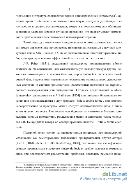 Позицию, интегрирующую оба подхода, излагает в монографии, посвященной циклотимии, Ю. В. Каннабих (1914). Согласно представлениям автора, клиническая реальность такова, что при циклотимии наряду с перемежающимся течением, также наблюдается и ремиттирующее. И если в первом случае картина межфазных промежутков свободна от признаков циклотимических колебаний, выходящих за пределы нормы (синдромальные ремиссии), то во втором - lucidaintervala - определяются вполне доказуемые (хотя и минимальные) колебания аффективного фона (симптоматические ремиссии). Сходных позиций относительно полиморфности исходов меланхолической фазы придерживается и Th. Ziehen (1897), выделявший наряду с выздоровлением - синдро-мальной ремиссией и неполное выздоровление - симптоматическую ремиссию.