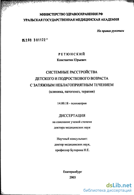 Ретюнский Константин Юрьевич. Системные расстройства детского и подросткового возраста с затяжным неблагоприятным течением (клиника, патогенез, терапия) : диссертация ... доктора медицинских наук : 14.00.18 / Ретюнский Константин Юрьевич; [Место защиты: Государственное учреждение "Научно-исследовательский институт психического здоровья Томского научного центра Сибирского отделения РАМН"].- Томск, 2003.- 387 с.: ил.