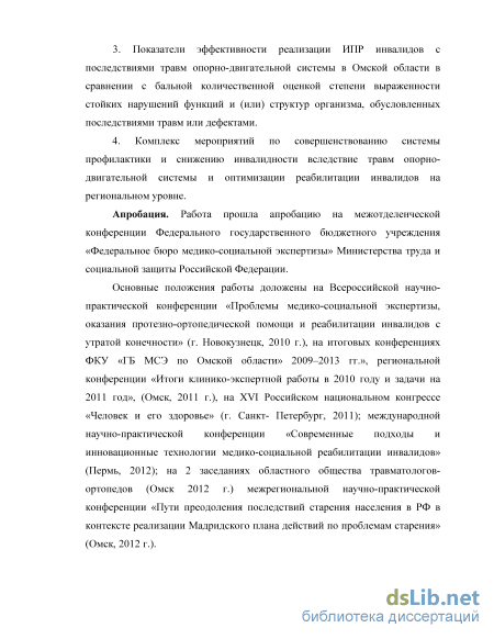 Основные положения работы доложены на научно-практических конференциях (Новокузнецк, 2010 г.; Омск 2011, 2012 гг.; Санкт-Петербург, 2011 г.; Пермь, 2012 г.), на итоговых конференциях ФКУ «ГБ МСЭ по Омской области» 2009–2013 гг.