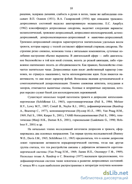 На начальных этапах исследований патогенеза депрессии и тревоги, сформировались два основных направления. Так первая группа исследователей (Bunney W.E., Davis J.M., 1965; Schildkraut J.J., 1965) предполагала, что в основе депрессии лежит торможение активности норадренергической системы, тогда как другая группа считала, что эти расстройства связаны с дефицитом активности серотони-нергической системы (Van Praag Н.М., 1969; Лапин И.П., Оксенкруг Г.Ф., 1969). Несколько позже A. Randrup и С. Braestrup (1977) высказали предположение, что дофаминергическая система также вовлечена в развитие депрессивных состояний. С начала 80-х годов наибольшее распространение в литературе получила моноами нергическая гипотеза депрессий и тревоги (Нуллер Ю.Л., 1981; Van Praag Н.М., 1969; Ressler K.J., Nemeroff СВ., 2000; Kasper S., 2001), которая связывает патогенетические механизмы этих состояний с дефицитом серотонина и норадреналина.