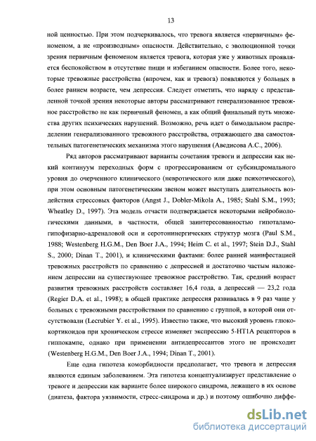 В исследованиях M. Hamilton (1988), при диагнозе «тревожное состояние» у 83 % больных наблюдалась депрессивная симптоматика, а у больных с депрессиями встречаемость тревожной симптоматики достигала 96 %. Так в исследованиях J.M. Gorman (1997) указывается, что тревога часто встречается у пациентов с депрессией в качестве симптома или сопутствующего заболевания (генерализованное тревожное расстройство, паническое расстройство, обсессивно-компульсивное расстройство, социальная фобия). 85 % пациентов с депрессией имеют выраженные симптомы тревоги (Gorman J.M., 1997) и 58 % страдают тревожными расстройствами в течение всей жизни (Kessler R.C. et al., 1996). Коморбидность депрессии и тревожных расстройств составляет: социальная фобия (27,1 %), простая фобия (24,3 %), генерализованное тревожное расстройство (17,2 %) и паническое расстройство (9,9 %) (Kessler R.C. et al., 1996). По данным T.F. Aartjan с соавт. (2000) частота коморбидности депрессии и тревожного расстройства — 47,5 %, частота коморбидности тревожного расстройства и депрессии — 26,3 %. Почти у 60 % больных с тревожными расстройствами выявляется депрессия (Greenberg Р.Е. et al., 1999; Lepine J.P., 2002). У больных с первичным диагнозом панического расстройства в 40-80 % случаев имеются указания на наличие эпизода депрессии (Вертоградова О.П., 1998; Холмогорова А.Б., Гаранян Н.Г., 1998). М. Zimmerman с соавт. (2000) отмечает, что у 74 % амбулаторных больных с униполярной депрессией наблюдаются тревожные расстройства: наиболее часто встречается социаль 9 ная фобия — у 1/3, паническое расстройство, специфические фобии и генерализованное тревожное расстройство диагностируется в 15 % случаев соответственно. У молодых пациентов коморбидность тревожного расстройства является важным прогностическим показателем, предопределяя более тяжелое течение депрессии, хронизацию заболевания (Clayton P.J. et al., 1991; Coryell W. et al., 1992; Sherbourne CD., Wells K.B., 1997; Lenze E.J. et al., 2000), увеличение суицидального риска (Johnson J. et al., 1990; Allgulander C, Lavori P.W., 1993; Grucza R.A., 2001), более длительный курс лечения и снижение эффективности лечения (Мосолов С.Н., 2007; Grunhaus L. et al., 1988; Brown С. et al., 2005; Kuzel R.J., 2005; Fava M. et al, 2008). Такие же взаимосвязи наблюдаются и при заболеваниях у пациентов среднего и пожилого возраста (Cassidy E.L. et al., 2005; Andreescu С. et al., 2007).