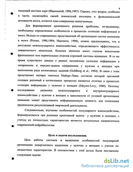 Для формирования креативного решения проблемы, по-видимому, необходимы определенные особенности в процессах селекции информации в мозге. Исходя из современных представлений об организации систем внимания в мозге (Posner, 1990,1994; Наатанен, 1998), можно предположить, что в регуляции межполушарного взаимодействия, определяющего эффективность дивергентного мышления, большое значение имеет степень вовлечения фронтальных или париетальных отделов корковой системы внимания. В то же время существуют данные о разных механизмах селекции информации в латеральном и передне-заднем направлении у мужчин и женщин при выполнении ряда когнитивных заданий (Goldberg et al., 1994). В связи с этим представляет интерес гипотеза Майерс-Ливи, согласно которой причиной половых различий в когнитивных процессах являются отличия в процессах селекции информации у мужчин и женщин (Meyers-Levy, 1989). Поэтому исследование динамики межполушарного и внутриполушарного взаимодействия у мужчин и женщин в зависимости от условий организации внимания может представлять информационную ценность для понимания предпосылок результативной творческой деятельности.