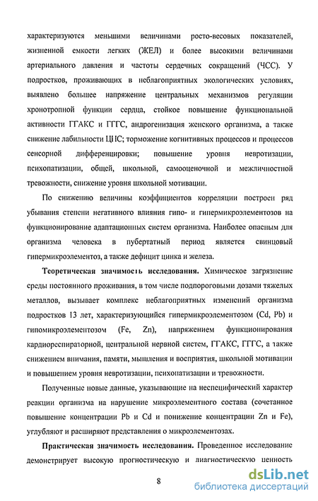 Теоретическая значимое і ь исследования. Химическое загрязнение среды постоянного проживания, в том числе подпороговыми дозами тяжелых металлов, вызывает комплекс неблагоприятных изменений организма подростков 13 лет, характеризующийся гипермикроэлементозом (Cd, Pb) и гипомикроэлементозом (Fe, Zn), напряжением функционирования кардиореспираторной, центральной нервной систем, ГГАКС, ГГГС, а также снижением внимания, памяти, мышления и восприятия, школьной мотивации и повышением уровня невротизации, психопатизации и тревожности.