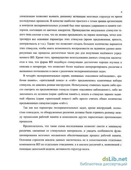 локализации позволяет выявить динамику активации мозговых структур во время исследуемых процессов. В качестве наиболее простого с точки зрения организации и контроля экспериментальных условий был взят процесс удержания в памяти паттернов, состоящих из цветных квадратов. Преимущество визуальных стимулов такого типа состоит в том, что их можно предъявлять на экране монитора, четко контролируя все основные параметры этих стимулов (время предъявления, яркость, контрастность и т.п.). Также это позволяет создать большое количество вариантов этих стимулов, чтобы иметь возможность воспроизвести на заданном уровне интересующие нас процессы достаточное число раз для получения надёжного усредненного ВП. Кроме того, преимущество использования данных стимулов заключается в том, что форма ВП подобную стимуляцию достаточно хорошо изучена и описана в литературе, что позволяет более надёжно интерпретировать различия в вызванных потенциалах в связи с различием экспериментальных задач.