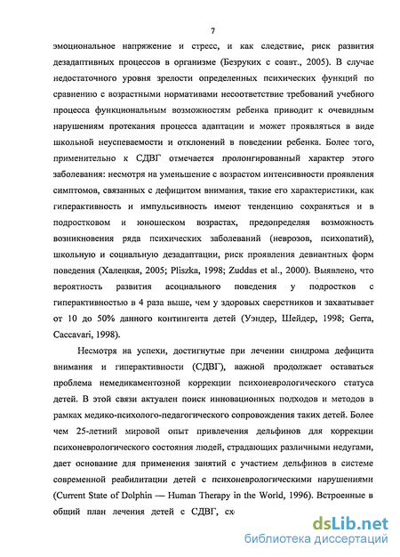 Несмотря на успехи, достигнутые при лечении синдрома дефицита внимания и гиперактивности (СДВГ), важной продолжает оставаться проблема немедикаментозной коррекции психоневрологического статуса детей. В этой связи актуален поиск инновационных подходов и методов в рамках медико-психолого-педагогического сопровождения таких детей. Более чем 25-летний мировой опыт привлечения дельфинов для коррекции психоневрологического состояния людей, страдающих различными недугами, дает основание для применения занятий с участием дельфинов в системе современной реабилитации детей с психоневрологическими нарушениями (Current State of Dolphin — Human Therapy in the World, 1996). Встроенные в общий план лечения детей с СДВГ, схемы коррекционно-развивающих