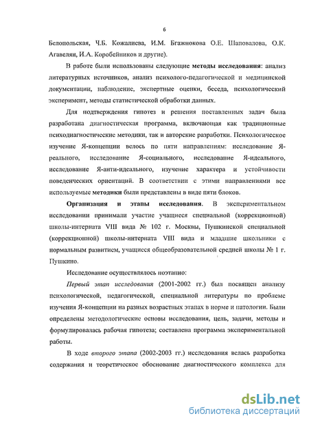 Первый этап исследования (2001-2002 гг.) был посвящен анализу психологической, педагогической, специальной литературы по проблеме изучения Я-концепции на разных возрастных этапах в норме и патологии. Были определены методологические основы исследования, цель, задачи, методы и формулировалась рабочая гипотеза; составлена программа экспериментальной работы.