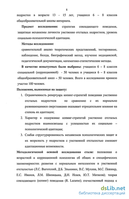 Методологической основой исследования стали: положения о возрастной и коррекционной психологии об общих и специфических закономерностях развития с нормальным интеллектом и умственной отсталостью (Л.С. Выготский, Д.Б. Эльконин, B.C. Мухина, М.С. Певзнер, Е.С. Иванов, Л.М. Шипицына, Д.Н. Исаев, Ю.Т. Матасов); теория совладающего (копинг) поведения (R. Lazarus); отечественный подход к