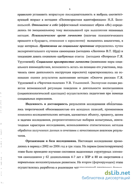 Организация и. база исследования. Настоящее исследование проводилось в период с 2002 по 2006 год в три этапа. На первом (констатирующем) этапе было проведено изучение состояния выделенных структурных элементов самосознания у 62 дошкольников 4-7 лет с ЗПР и 80 их сверстников с нормальным интеллектуальным развитием. На втором (формирующем) этапе осуществлялась разработка и реализация четырехэтапной программы форми-