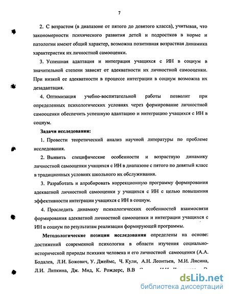 Методологические позиции исследования определены на основе: достижений современной психологии в области изучения социально-исторической природы психики человека и его личностной самооценки (А.А. Бодалев, Л.И. Божович, У. Джеймс, Ч. Кули, А.Н. Леонтьев, М.И. Лисина, Л.И. Липкина, Дж. Мид, К. Рождерс, В.В. Столин, И.И. Чеснокова, Э.