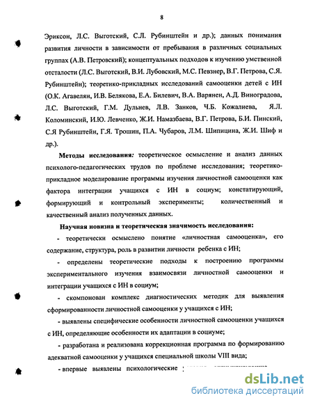 Цель исследования; выявить психологические особенности взаимосвязи формирования личностной самооценки и интеграции учащихся специальной (коррекционной) школы VIII вида в социум.