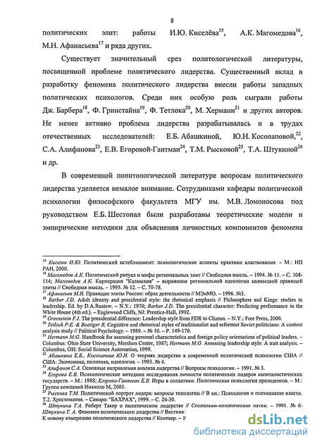 Существует значительный срез политологической литературы, посвященной проблеме политического лидерства. Существенный вклад в разработку феномена политического лидерства внесли работы западных политических психологов. Среди них особую роль сыграли работы Дж. Барбера , Ф. Гринстайна , Ф. Тетлока , М. Херманн и других авторов. Не менее активно проблема лидерства разрабатывалась и в трудах отечественных исследователей: Е.Б. Абашкиной, Ю.Н. Косолаповой,22, С.А. Алифанова , Е.В. Егоровой-Гантман , Т.М. Рысковой , Т.А. Штукиной и др.
