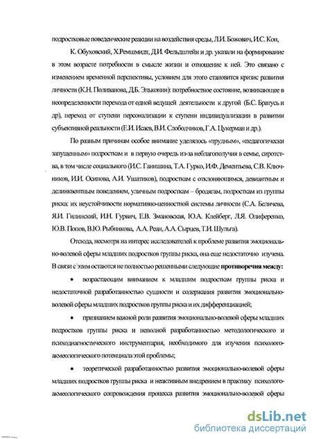 Во многих психолого-педагогических исследованиях отмечается, что в современном обществе значительное изменение коснулось показателей отклоня-ющегося поведения подростков группы риска. Анализ официальной информации (С.В. Алексеев, А.Г. Асмолов, И.В. Вачков, И.В. Дубровина и др.) на базах средних школ показывает, что в несколько раз увеличилось число подростково-молодежных объединений криминогенной направленности (Ю.А. Парфенов), влияние таких групп на подростков и юношей в период их обучения в средней школе значительно возросло, расширились круг объектов посягательства, время и характер совершения преступлений и правонарушений. Психологические особенности детей с нарушениями эмоционально-волевой сферы давно стали предметом психологического анализа (Л.С. Выготский, Л.И. Божович, В.И. Лубовский, И.И. Селецкий). Новые и не существовавшие ранее тенденции аутодеструкций в эмоционально-волевой сфере личности пока еще не стали предметом пристального психологического исследования как в теоретическом, так и в практическом плане. Малоизученными остаются проблемы коррекции эмоционально-волевой сферы младших подростков группы риска. Не получила полного решения проблема развития эмоционально-волевой сферы младших подростков группы риска, психологически непознанным пока еще остается процесс развития эмоционально-волевой сферы младших подростков группы риска.