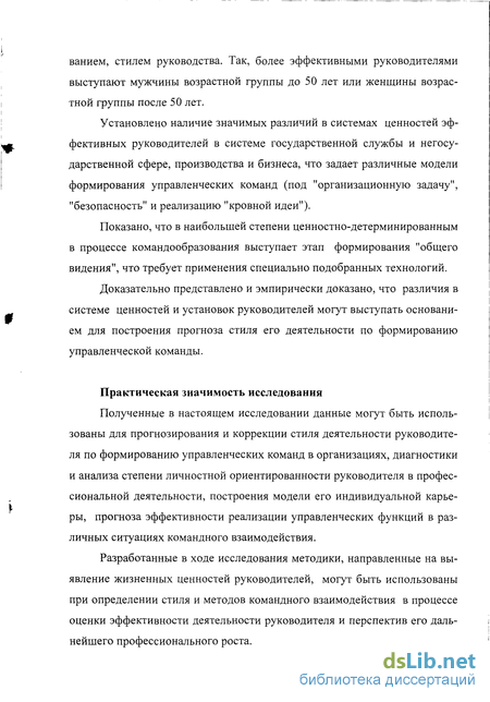 Проблема выявления системы ценностей руководителей, детерминирующих процесс формирования им своего ближайшего окружения в организации, подбора управленческой команды рассмотрена в системе соци ально-психологических и психолого-акмеологических знании. Выявлены содержание и структура жизненных ценностей руководителей государственных и негосударственных организаций, определяющих специфику формирования управленческих команд, проанализированы основные факторы, влияющие на изучаемый процесс: социальная ситуация развития руководителя; его индивидуально-психологические особенности; характер ориентации на внешние нормы и внутренние ценности; адекватность отражения им внешне заданных норм; жизненные ценности, сформированные под влиянием его опыта.