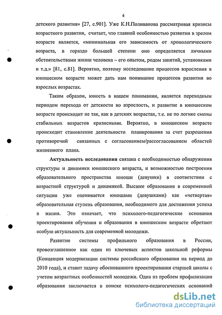 Мы, так же как и Л.С.Выготский придерживаемся мнения, что юность является переходным возрастом, в котором меняются принципы развития с детских на взрослые. «Юность не относится нами к схеме возрастных периодов детства по той причине, что в одинаковой мере заставляют сопротивляться чрезмерному растягиванию детского развития и включения в него первых 25 лет жизни человека, по общему смыслу и по основным закономерностям возраст от 18 до 25 лет составляет, скорее начальное звено в цепи зрелых возрастов, чем заключительное звено в цепи периодов детского развития. Трудно представить себе, чтобы развитие человека в начале зрелости (от 18 до 25) могло быть подчинено закономерностям детского развития» [27, с.901]. Уже К.Н.Поливанова рассматривая кризисы возрастного развития, считает, что главной особенностью развития в зрелом возрасте является, «минимальная его зависимость от хронологического возраста, в гораздо большей степени оно определяется личными обстоятельствами жизни человека - его опытом, родом занятий, установками и т.д.» [81, с.81]. Вероятно, поэтому исследование процессов взросления в юношеском возрасте может дать нам понимание процессов развития во взрослых возрастах.